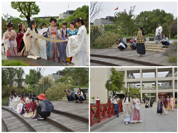 教职工书画协会的老师们援笔濡墨,倾情抒写,将对中国传统文化的热爱寄情于汉字之美;校学生社团琼花国学社的同学们展示了一场优美的“汉服秀”,他们身着各色汉服,或弄裾起舞,或临水抚琴,一颦一笑之间表达了对传统服饰文化的追慕之情;摄影协会老师们频频举起相机,找角度,寻光线,换镜头,时而相互交流,时而凝神构图,各自捕捉心中美丽瞬间。