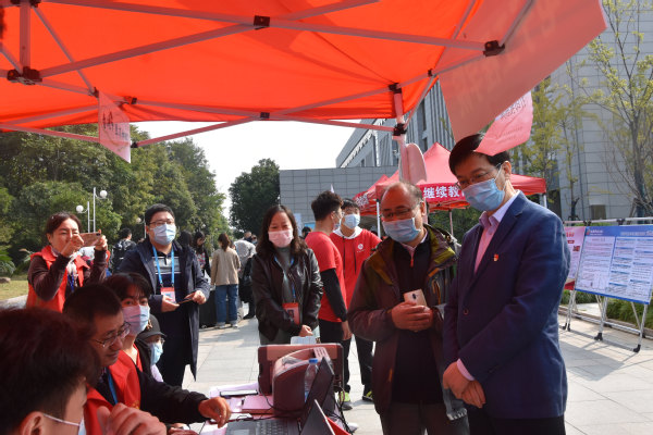接站大巴上创意十足的鲜红迎新标语,迎新点上络绎不绝前来报到的新生,大屏幕上滚动播放的校园文化活动片段,满头大汗运送各种行李的志愿者……10月17-18日,布置一新的学校校园彩旗飘扬、人声鼎沸,洋溢着欢乐祥和的节日气氛。来自全国13个省、自治区的5000余名2020级新生从四面八方汇聚古城扬州、踏上芳华大道,在美丽的映月湖畔开启他们新的人生航程。校领导周胜、潘锦全、许金如、王如平、陈亚鸿、刘宏、黄华明以普通党员的身份走进报到现场,和新同学亲切交流,与各学院、部门的工作人员一起做好新生的接待工作。