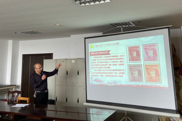 在我国已经发行的11套建党纪念邮票中,陈久安选择了1947年7月1日发行的第一套建党邮票,从印有头戴八角帽的毛主席正面头像的邮票讲起,在带领同学们瞻仰伟人毛泽东风采的同时,进一步了解八角帽及其诞生的历史背景。为了让红色故事的讲述更加深入人心,党课还介绍了1977年9月9日发行的纪念伟大领袖和导师毛泽东主席逝世一周年的邮票。邮票上毛泽东身穿红军蓝灰军衣,头**星八角帽,容光焕发、神采奕奕地站在延安窑洞门口。邮票的图案来源于一张珍贵的经典照片,在那个战火纷飞的年代,这张照片犹如燎原之火,将毛泽东和中国工农红军的形象传遍了全世界。同学们全神贯注沉浸于邮票背后的故事中。