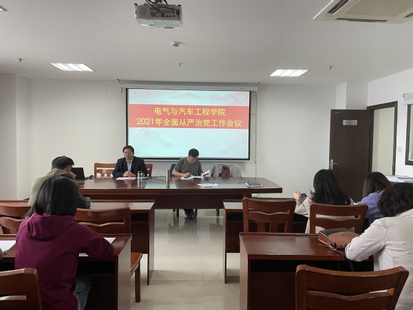 5月12日,电气与汽车工程学院在图书馆902会议室召开了2021年度全面从严治党工作会议,认真学习贯彻习近平总书记在十九届中央纪委五次全会上的重要讲话精神,学习《中国共产党第十九届中央纪律检查委员会第五次全体会议公报》,传达学习学校2021年全面从严治党工作会议精神,部署2021年度全面从严治党和党风廉政建设工作。
