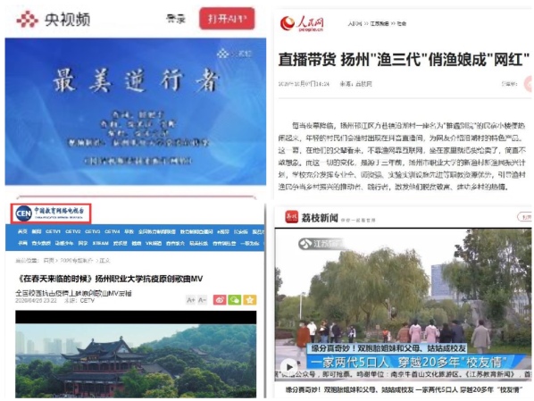 此外,我校对外宣传产生了许多影响力较大的新闻报道。由我校制作的歌曲MV《在春天来临的时候》《驻村干部》分别入选中国教育电视台举办的“全国校园抗击疫情主题公益歌曲MV展播”“教育铺筑小康路 全国校园歌曲展播”活动,并通过该台全媒体向广大观众进行展播;我校助力邗江区方巷镇沿湖村振兴的事迹被中国青年报、江苏电视台教育频道、人民网、学习强国、网易新闻等多家媒体先后报道,中国小康网、中国共产党员网全文转载;在我校新生报到现场,江苏省广电总台记者采访医学院新生双胞胎姐妹朱幸玲、朱幸婷等新闻在江苏卫视、江苏公共频道、江苏教育频道播出后,仅荔枝新闻观看人次就达100W+,新闻被CCTV央视网、光明网、环球网、央广网、学习强国、荔枝网、我苏网等媒体转发;在教师节当天,我校优秀校友李娟娟在荣获全国抗疫新冠肺炎先进个人称号后,回到母校感谢师恩,为学弟学妹们上“开学第一课”,被交汇点新闻科教频道聚焦报道。