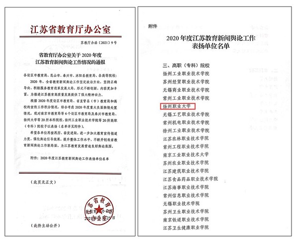 日前,江苏省教育厅办公室发布2020年度江苏教育新闻舆论工作情况通报,在全校各学院、部门的共同努力下,学校2020年新闻宣传工作取得历史性突破,新闻宣传总积分达1713,位居全省高职院校第二位,被评为“2020年度江苏教育新闻舆论工作表扬单位”。