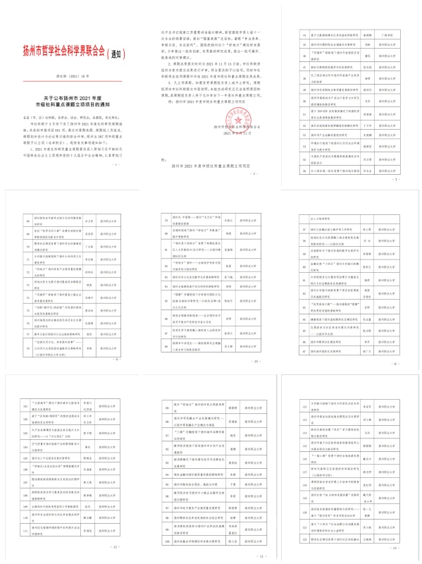 日前,扬州市社科联公布2021年度市级社科重点课题立项名单。据悉,市社科联今年共收到申报项目651项,经过对课题选题、课题组人员组成、课题初步设计与论证等方面的综合评审,共立项367项市级重点课题,其中,我校78项社科研究课题成功入选。