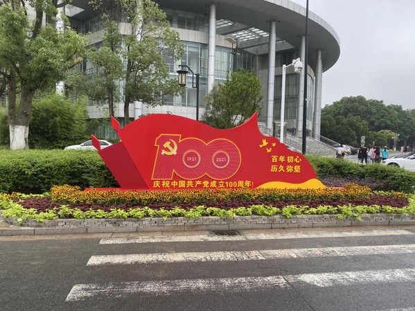黄色的金光菊,红色的彩叶草,绿色的金叶薯……一束束鲜花经过精心修整汇成花海,错落有致地铺设在庆祝建党百年的标识四周。花圃精心设计成红船造型,红色的建党100周年标识好似船帆,寓意着中国共产党百年初心历久弥坚,扬帆起航,开创新征程。
