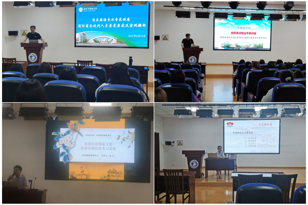 为培养优质的现代外语专业应用型人才,我校外国语学院商务英语和应用英语实训课程打破以传授知识或理论为中心的模式,采取邀请行业专家进校园,开展专题讲座的形式实施教学。6月中下旬,外国语学院3家校企合作单位相关专家——扬州旅游营销中心有限公司董事长、扬州市旅游协会执行副会长兼秘书长肖洁,扬州市丰盛贸易有限公司国际业务总监高箭和扬州瘦西湖导游服务部副部长李丽走入课堂,为同学们奉上一场场精彩绝伦的文化大餐。