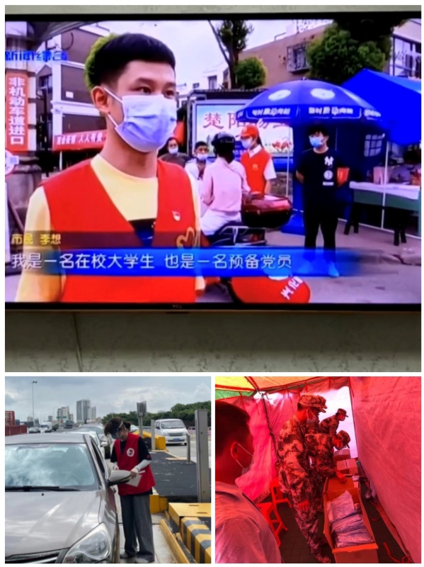 “我是一名在校大学生,同时我也是一名预备党员。作为青年我应有担当,作为党员我更有义务!”由于志愿服务成绩突出,机械H181的学生党员李想接受兴化电视台采访时如此表示。疫情一发生,李想就投入到当地社区的防控工作中,每日负责办理居民出入证,统计居民核酸检测情况,照看居家隔离人员,在核酸检测采集点帮助不会使用智能设备的老年人准备健康码和行程码等。李想说:“虽然这些工作十分琐碎,但能服务老百姓令我很有成就感,我每天都带着党徽,看着大家信任的眼神,我感到十分自豪!”