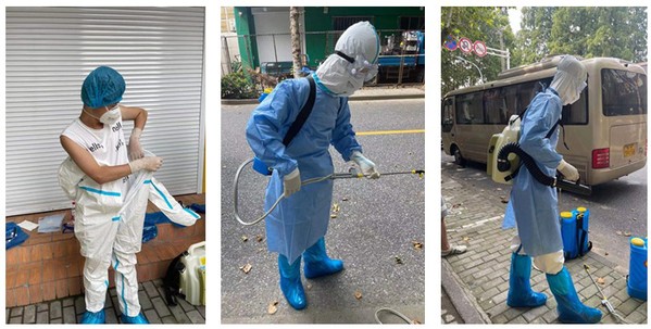 这3位同学每天被防护服裹得严严实实,背负着二十多斤的喷雾器,到隔离宾馆、确诊患者家中等地进行消杀,有时还需要负责清理室内的生鲜和冰箱里的物品。他们每天早出晚归,随时待命,一旦接到指示,立即外出执行任务。对于消杀员来说,加班到凌晨是常有的事,有时还会因为在密闭空间里喷洒消毒剂吸入过多二氧化氯而咳嗽或呼吸困难。