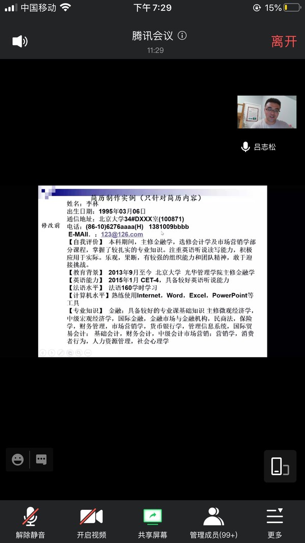因学生尚未返校,讲座以腾讯会议方式开展,电子学院邀请就业工作经验丰富的吕志松老师作为讲座主讲人。吕志松以他个人的职场心得体会、企业招聘经验切入主题,从简历的功能和作用、结构与内容及制作的小技巧三方面向同学们介绍了简历制作的相关内容,指导同学们规范简历写作。他强调简历要有明确的求职意向,切忌一个简历走天下,应针对不同的企业性质、岗位,有针对性的对简历进行调整。同时还对简历中的重点内容:即专业实践经历、社会实习经历、培训经历的撰写进行了详细的说明,并展示了优秀的简历样本,最后吕老师对毕业生关注的三方协议、档案、户口问题作了详细的讲解。