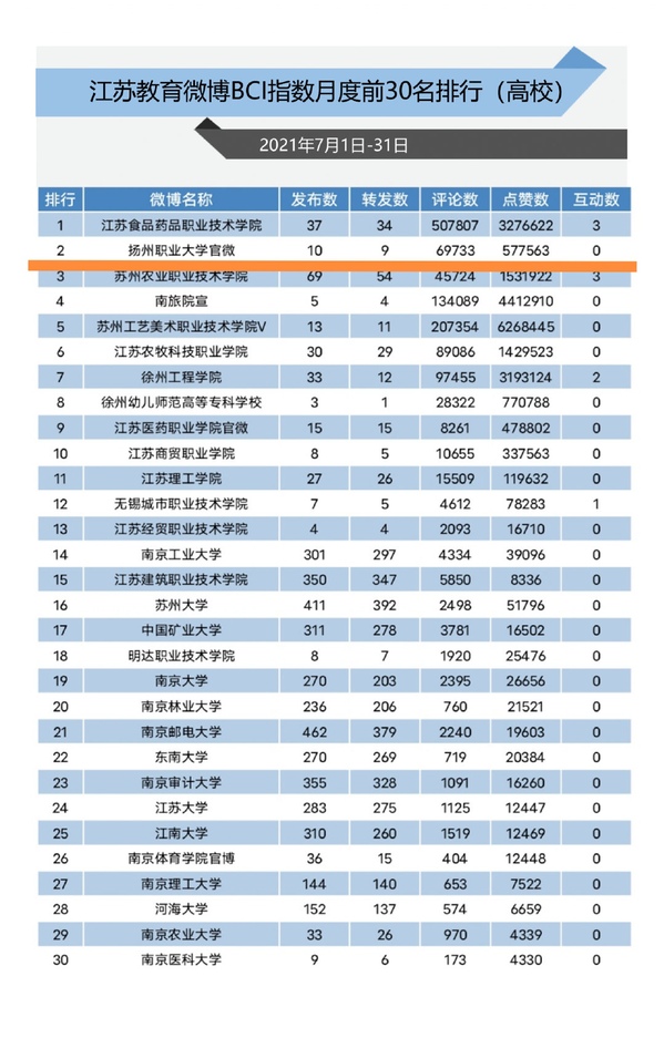 9月9日,江苏省教育厅官方微博“江苏教育发布”对省内教育部门和高校的官方微博传播效果进行了排名。我校官方微博“扬州职业大学官微”在7月份江苏省教育微博BCI排行榜中位列第2位,这是自我校官方微博创建以来首次进入排行榜,也体现出我校在融媒体宣传中主动作为,硕果累累。