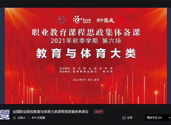 为深入了解课程思政相关政策,发挥课程思政项目引领作用,总结推广职业教育课程思政优秀典型经验,9月25日,师范学院组织全院教师参加了金华职业技术学院主办、高等教育出版社及新华网协办的在线直播会议——全国职业院校教育与体育专业大类课程思政集体备课会。