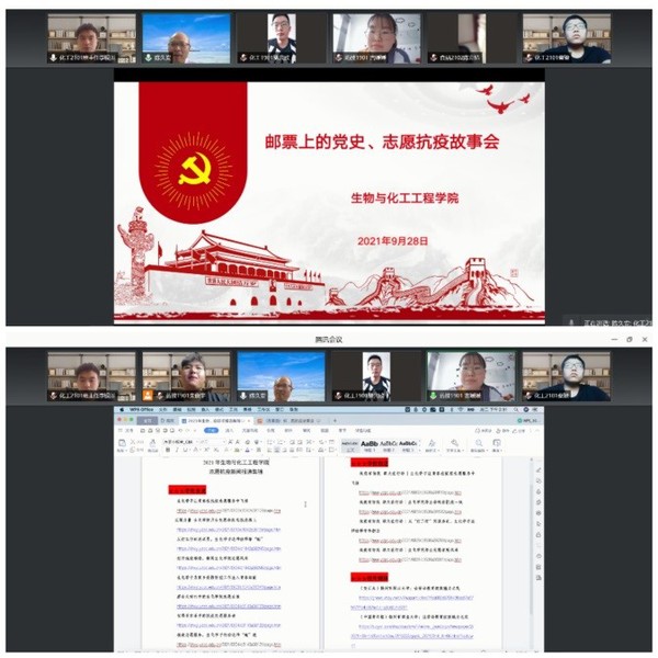 9月28日下午,生物与化工工程学院184名新同学共同聆听了由学哥学姐主讲的以“邮票上的党史”“志愿抗疫”为主题的“云端”故事会。学院分管领导、学工办老师及2021级新生助理班主任参加了故事会。故事会由学院学工办主任吴美瑾主持。