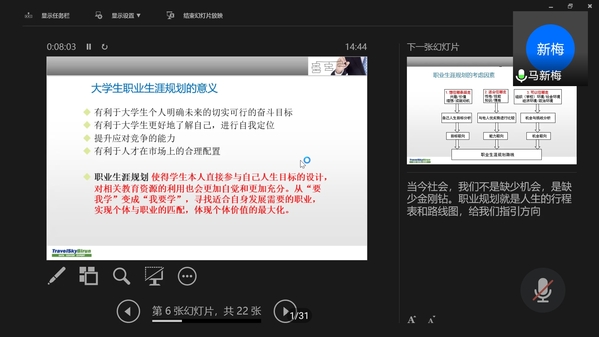 为帮助2021级新生牢固树立职业生涯规划意识,引导新生珍惜时光、从入学开始规划好三年大学学习生活,近日电气与汽车工程学院经过精心筹备,特邀学院校企合作单位北京中航信百润科技有限公司行政人事部总经理马新梅女士在线与同学们共话职业生涯规划问题,学院252名新生参加了此次讲座。