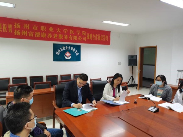 11月1日下午,医学院院长罗惠媛与扬州富德康养老服务有限公司朱宝总经理签订了《产学研合作协议》。该公司旨在构建居家社区机构相协调、医养康养相结合的养老服务体系,为失能及半失能老人提供居家护理服务,与医学院护理专业的人才培养目标具有较强的相关性。