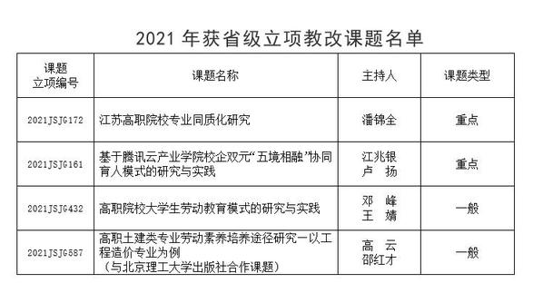 近日,江苏省高等教育学会下发《关于公布2021年江苏省高等教育教改研究立项课题评选结果的通知》,我校推荐的教学改革研究课题获省级立项重点课题2项、一般课题2项。