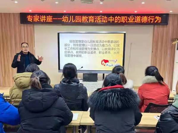 为加深与校外实践基地的互动交流和双方合作,1月5日下午,我校高志明教授应邀为师范学院实践教育基地——扬州市金太阳幼儿园60多位教师做“幼儿园教育活动中的职业道德行为”讲座。