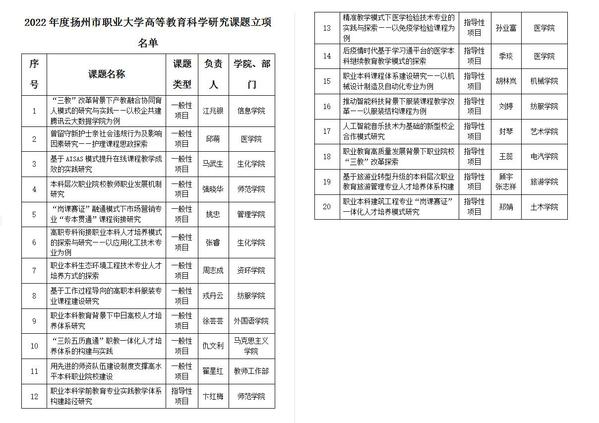 2021年10月,中办、国办印发《关于推动现代职业教育高质量发展的意见》提出,推动不同层次职业教育纵向贯通,促进不同类型教育横向融通,强化职业教育的类型特色。为了贯彻落实《意见》,促进国家政策落地生根,推动学校高质量发展,结合学校“职教贯通培养”重点工作,高教研究所积极开展“职业教育纵向贯通”专题课题研究工作,并以此作为2022年度学校高教研究课题的主题。经前期调研、广泛动员、教师申请、专家评审、结果公示,最终确定了20项立项课题,其中,一般性项目11项,指导性项目9项。