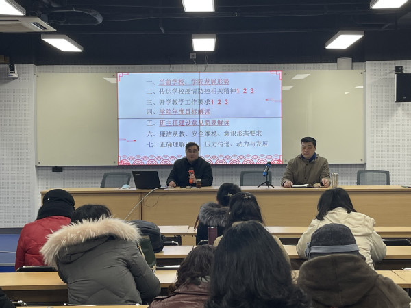 学院院长厉爱民首先结合我校“十四五”发展规划全面分析了当前学校、学院的发展形势,对2022年学院标志性成果任务清单做了重点阐述。随后对开学教学工作做了部署,传达了学校疫情防控相关精神,强调了防疫相关要求。简要解读了班主任队伍建设意见,同时在廉洁从教、安全维稳、意识形态三方面对教职工提出明确要求,激励学院上下形成合力,将高质量发展的压力转化成学院建设的动力。