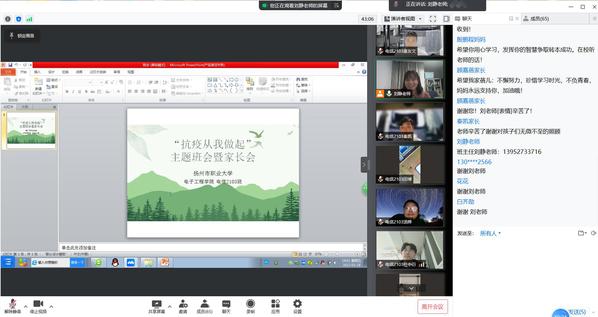 家长会上,班主任首先介绍了目前扬州疫情形势下,学校迅速有效地实施封闭管理,落实各项防控措施,转为线上教学,对全员进行了核酸检测,对外来快递进行消杀处理,在食堂门前设置消毒措施,确保了同学们的安全,请各位家长放心。班主任解读了致全体同学的疫情防控倡议书,号召同学们积极配合,做好信息排查、核酸检测、健康监测、隔离观察等各项管控措施,坚持不点外卖,少买快递,食堂就餐同向而坐,在校园内和公共场所规范佩戴口罩,勤洗手勤通风等,同时也积极寻求家长的支持,在特殊时期耐心倾听,关心关爱孩子心理健康。