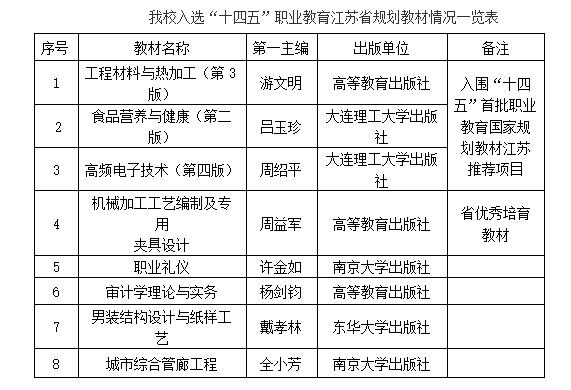 近日,江苏省教育厅公布省“十四五”首批职业教育规划教材名单,我校8部教材入选,其中有3部教材遴选为“十四五”首批职业教育国家规划教材江苏推荐项目。据悉,全省共确定482部高等职业教育教材为“十四五”职业教育江苏省规划教材。今年我校入选教材情况创历史新高。