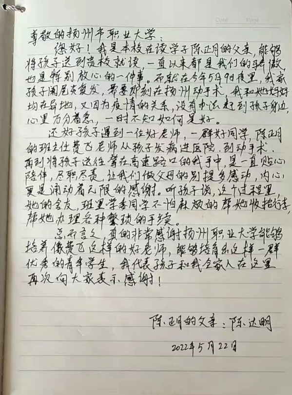 5月22日,经贸学院收到一封来自家长的感谢信,感谢费飞老师对生病学生的彻夜守护。