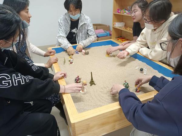 “认识你自己”是困难的事,但一个沙盘,可以让认识自己成为一件相对简单而直观的事情。在主持人的带领下,同学们以小组的形式围在沙箱旁,先是细细体味触摸沙子的感受,随后根据主持人设定的主题展开联想,在自由、愉悦的氛围中按顺序选取沙具,小心地在沙箱中摆放。在交流环节,同学们沉浸于共同创造的世界,真诚分享自己的内心感受,尽情表达自己的想法。在主持人的指引下,大家与真实的自我交谈,映射出内心的写照与希望。