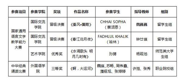 根据《教育部办公厅关于举办第四届中华经典诵写讲大赛的通知》精神,第二届江苏省国家通用语言文字教学能力大赛由省语委、省教育厅、省文明办、省文旅厅、省新闻出版局、省全民阅读办和省广播电视台等多家单位共同主办,经学校推荐、网络投票及省级评审,我校国际交流学院CHHAI SOPHA (蔡颂恩)、FADHLUL KHALIK (哈林)作品被评为留学生组晋级决赛作品,艺术学院孙旖获师范类大学生组优秀奖;同期公示的2022年“筑梦向未来”中华经典诵读大赛获奖名单中,我校外国语学院魏琪、苏畅、周伟鑫、潘祖旭、张婷婷合作的作品获三等奖。