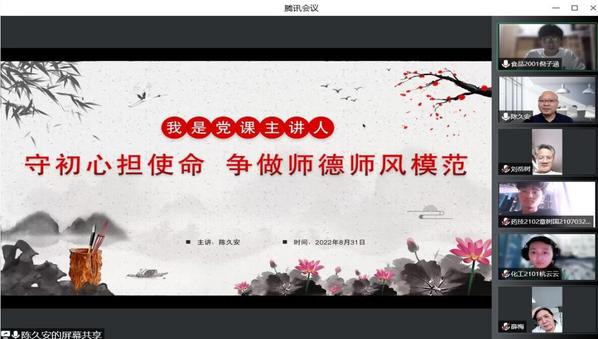 8月31日下午,生物与化工工程学院负责人在“云”端开讲党课,开展了一堂由《立德树人》邮票开启的师德师风教育会。党课主讲人依次展示五组教育题材邮票,紧紧围绕“使命”“初心”“思想”“讲台”“节日”五个关键词进行宣讲。学院全体教职工、部分学生代表共63人聆听了党课。
