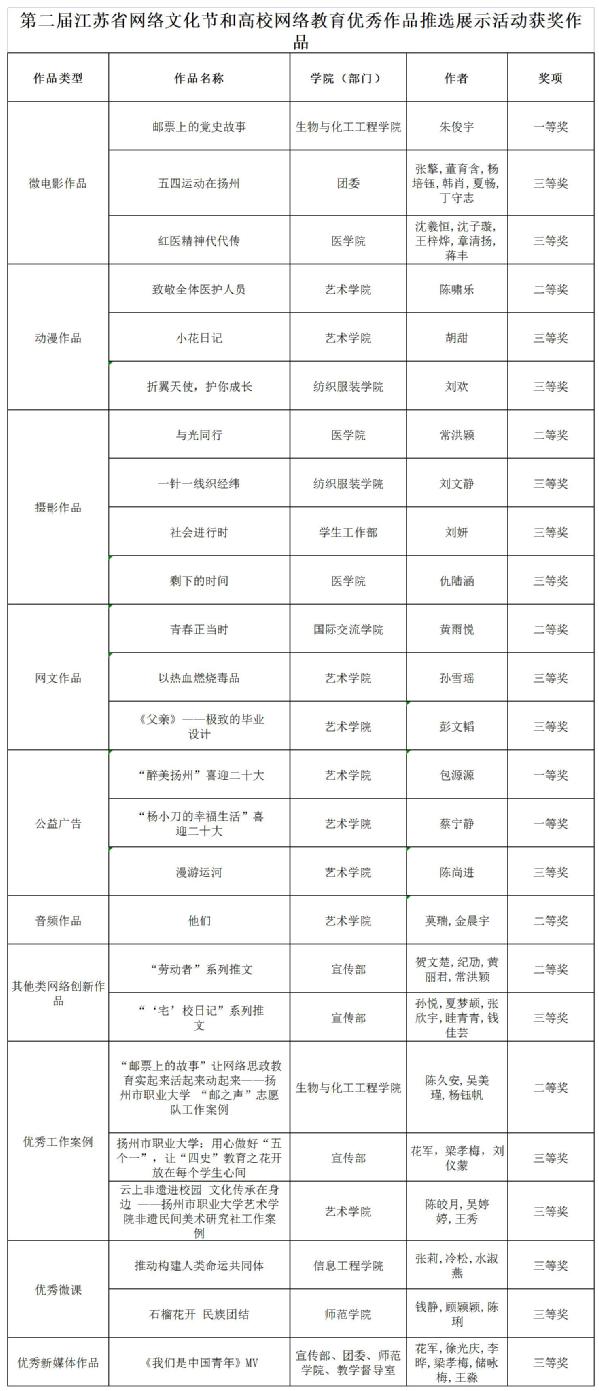 近日,省委教育工委、省教育厅公布了《第二届江苏省大学生网络文化节和高校网络教育优秀作品推选展示活动遴选结果公示》,我校在微电影作品、动漫、摄影、网文、公益广告、音频、其他类网络创新作品、优秀工作案例、微课、新媒体作品等10类作品征集活动中喜获佳绩,共计25件作品获奖,其中一等奖3项、二等奖6项、三等奖16项,13件获奖作品作为江苏省推荐的优秀作品参加教育部第六届全国大学生网络文化节和高校网络教育优秀作品评比。