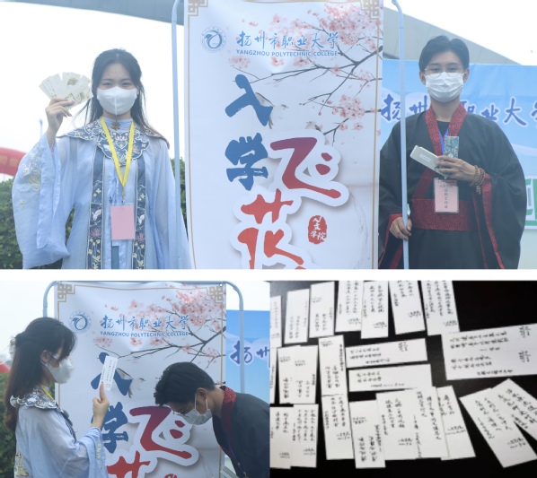 为进一步传承和弘扬中华民族优秀传统文化,充分调动学生对诗词的兴趣,丰富学生人文素养,9月16日上午,人文学院开展“飞花令”特色主题活动。身着中国传统汉服的两名学生在迎新活动中显得格外亮眼,他们手中拿有8字卡片,在向“萌新”们传递着“知行合一,立德树人”校训。新生随机抽取一个字,进行作答,成功作答后将会得到人文学院教师们亲笔写的书签。“路漫漫其修远兮,吾将上下而求索”“锲而不舍,金石可镂”“欲穷千里目,更上一层楼”“会当凌绝顶,一览众山小”……都是人文教师对新生殷切的祝福与期望。(周楠 陈青青)