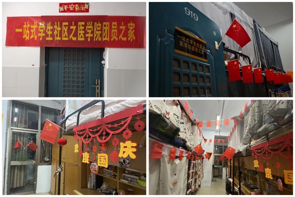 近日,医学院积极推进“一站式”学生社区建设,在各班级宿舍中挂牌成立了“团员之家”。“团员之家”的团员青年们以饱满的姿态、愉悦的心情积极投入宿舍卫生大扫除、内务整理中,并对宿舍环境进行了美化布置,宿舍内插满了一面面鲜红的国旗,一些团员之家还挂起了“欢度国庆”的剪纸卡,营造了浓浓的节日氛围,以劳动之美、环境之美为伟大的祖国母亲庆生。