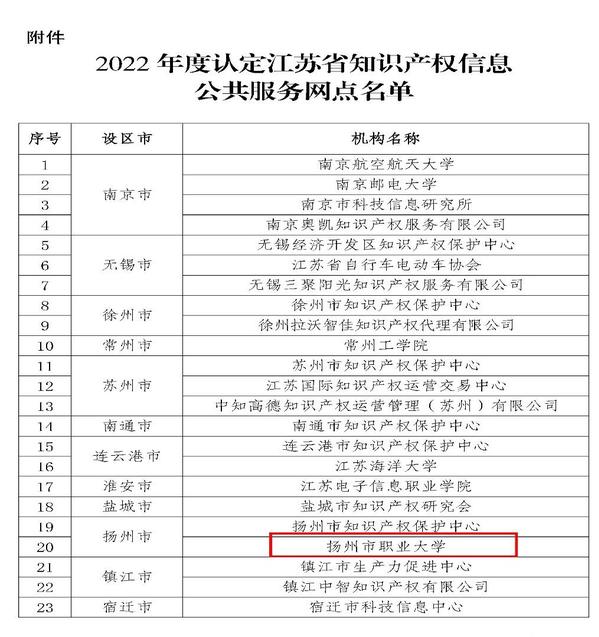 11月10日,江苏省知识产权局公布2022 年度江苏省知识产权信息公共服务网点名单,我校经申报推荐、形式审查、专家评审、集体决策、公示等程序成功入选。此次入选标志着我校知识产权信息服务能力迈上新的台阶。