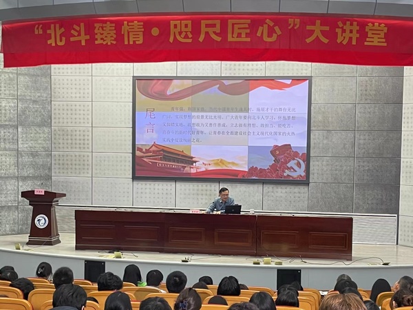 黄华明以“北斗精神导航人生梦想”为专题,结合学院专业发展历程、专业建设特点,阐述“北斗精神”的历史传承与现实意义。新时代北斗精神的内涵“自主创新、开放融合、万众一心、追求卓越”,一代代航天人以“祖国利益高于一切、党的事业大于一切、忠诚使命重于一切” 的责任担当,用信念之火点燃了北斗之光,推动北斗全球卫星导航系统闪耀浩瀚星空、服务中国与世界。黄华明希望年轻学子将“北斗精神”融入个人理想,脚踏实地、行稳致远,认真感受新时代北斗精神的召唤,勇于攻坚克难,追求卓越,争当堪当大任的新时代青年。