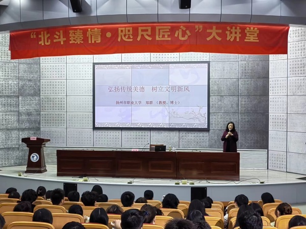郑群教授以“弘扬传统美德 树立文明新风”为主题,用风趣幽默、浅显易懂的言语表达了弘扬中华优秀传统文化的重要性。她结合扬州文明有礼二十四条,从思想品德文明、行为举止文明、学习纪律文明、仪表穿搭文明等分析了大学生在生活和学习中应该注意的一些问题,讲述了如何传承好“仁义礼智信、温良恭谦让、忠孝廉耻勇”等传统美德,用多名正能量人物事迹展示中国的传统美德和文明标准,呼吁同学们要弘扬中华优秀美德,树立社会文明新风。
