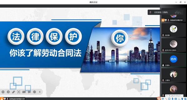 周海森律师曾任中国齐二机床厂、中安重工自动化装备有限公司人事副总、安信工人事处副处长、中城投第五工程局吉林公司总经理,他结合丰富的个人工作经历和专业学识,将法律条文与具体案例相结合,生动地介绍了劳动者试用期的常见问题、工资与加班工资的法律规定、员工违反公司制度时用人单位的常见做法、用人单位未履行劳动合同需要进行的经济补偿与赔偿等职场法律知识。讲座结束后,周海森与学生进行了在线互动,还解答了关于劳动争议的困惑,并为同学们介绍了搜集证据、保护自己合法权益的具体方法。