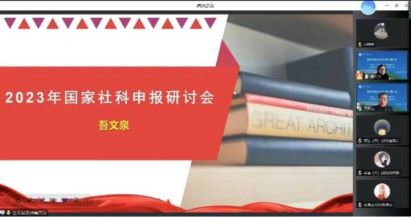 为不断加强学院教师的科研水平,提升高级别课题申报的质量和成功率,日前,外国语学院特邀江苏科技大学吾文泉教授在线举办“2023国家社科基金项目的申报”专题研讨会,学院教师和英语本科专业学生聆听了报告。