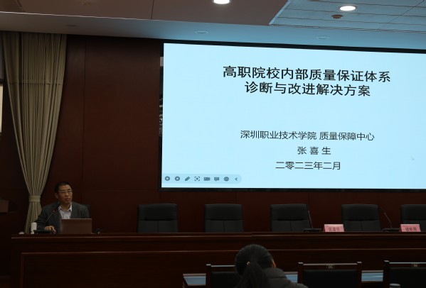 为高质量推动学校“双高”建设工作,构建学校内部质量保证体系,加快启动教学诊改相关工作,应教学督导室邀请,2月11日,深圳职业技术学院质量保障中心主任张喜生来我校指导内部质量保证体系建设工作。当天下午,张喜生教授做了《高职院校内部质量保证体系诊断与改进解决方案》的报告。各学院教学工作主要负责人,教师工作部、教务处、设备处等有关职能部门同志参加了会议。