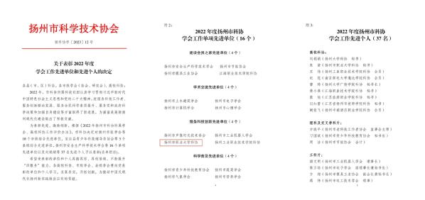近日,扬州市科学技术协会下发了《关于表彰2022年度学会工作先进单位和先进个人的决定》,我校科协喜获扬州市科协服务科技创新先进单位。