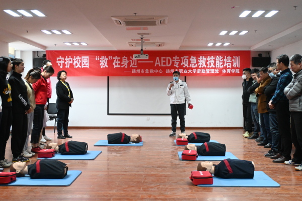 为了向体育学院师生普及急救知识,增强自救、互救能力,掌握正确使用AED设备应对突发心肺骤停者的方法,3月8日下午,体育学院联合后勤管理处邀请扬州市急救中心专业人员为体育学院师生开了一堂AED专项急救技能培训课。