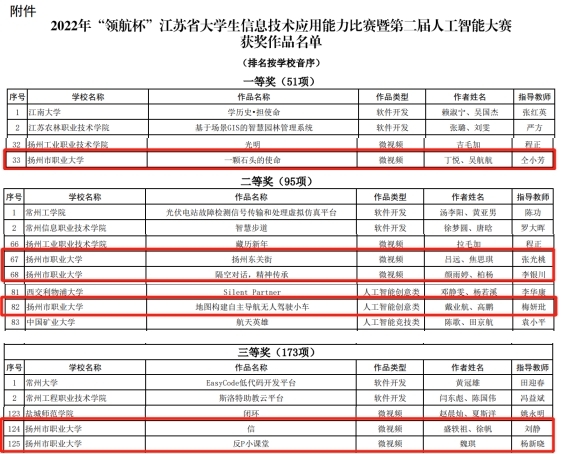 近日,省教育网络安全和信息化领导小组办公室公布了2022年“领航杯”江苏省大学生信息技术应用能力暨第二届人工智能比赛的获奖名单,我校共获奖6项:土木学院仝小芳老师指导的丁悦、吴航航学生微视频作品《一颗石头的使命》获一等奖;信息学院张光桃老师指导的吕远、焦思琪学生微视频作品《扬州东关街》,生化学院李银川老师指导的颜雨婷、柏杨学生微视频作品《隔空对话,精神传承》,电子学院梅妍玭老师指导的戴业航、高鹏学生人工智能创意类作品《地图构建自主导航无人驾驶小车》三个项目获二等奖;电子学院刘静老师指导的盛轶祖、徐帆学生微视频作品《信》,外国语学院杨新晓老师指导的魏琪学生微视频作品《反P小课堂》两个项目获三等奖。