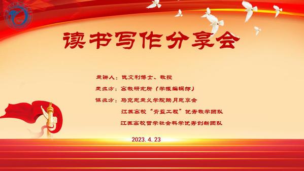为助力师生形成爱读书、读好书、善读书的浓厚氛围,在4月23日第28个世界读书日的当天,高教研究所副所长仇文利教授为师生带来了读书写作分享会。讲座由高教研究所(学报编辑部)主办,马克思主义学院映月思享会、江苏高校“青蓝工程”优秀教学团队、江苏高校哲学社会科学优秀创新团队协办,以线上形式开展。