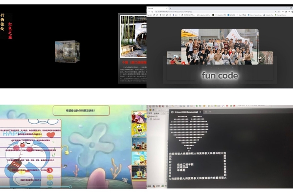 本次活动得到了广大同学的积极响应,共收到优秀作品20余份。其中网络2106班李苏鹏同学的作品《竹西佳处红色之旅》通过网页形式展现扬州个园(渡江战役指挥部)、抗日战争最后一役纪念馆等红色景点资料,在了解扬州光辉历史和灿烂文化同时,缅怀革命先烈、传承红色精神。软件2101班曹淑婷同学通过基于Maven的WebApp项目制作照片墙,记录生活中的美好瞬间,表达对过往的怀念和对未来憧憬。软件2201班张成奥同学利用Visual Studio Code编写代码,借助海绵宝宝和派大星之间的美好情感,表达对父母、对老师、对同学的感谢和祝福。网络2104单雄彪同学利用C语言编写代码,绘制出爱心图案,抒发对母校的感恩与热爱之情。