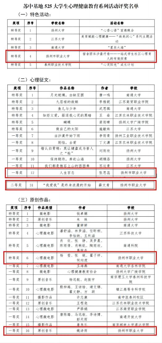 6月27日,苏中基地525大学生心理健康教育系列活动评选结果公布。我校报送的特色活动《团体沙盘疗愈——一站式学生社区心理育人的有效探索》获特等奖;报送的4项学生作品(心理征文、原创作品),获特等奖1项,一等奖2项,二等奖1项。