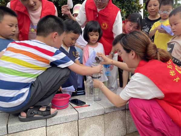 志愿者成员们整理出调研成果之后,便走进社区、广场、公园、小学等场所面向不同群体开展理论宣讲,宣传过程中他们充分发挥专业特长,现场做“水资源净化”等实验增加宣讲的趣味性,吸引了很多民众及小朋友前来听讲。“哥哥姐姐们,我可以试试这个污水过滤实验吗?”“我也想试试!”明月湖畔,小朋友们争先恐后,跃跃欲试。志愿队成员颜雨婷利用绘画特长用心地设计了运河文化文创产品——运河团扇,只见团扇上的图案以扬州段的大运河为背景,丰富的场景融合在一个画面中,有扬州文峰塔,有市花琼花,有扬州特色早茶,有木舟、有鱼、有花、有仙鹤,让运河文化“活灵活现”。志愿者们将团扇分发给民众们,不仅推动运河文化深入人心,还为民众们送上了纳凉的小工具,实用且暖心。