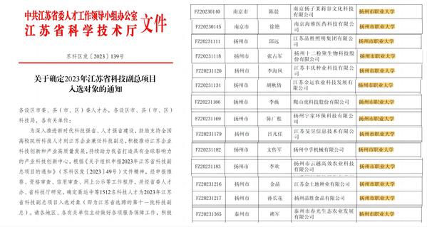 近日,江苏省委人才办、江苏省科技厅公布了2023年江苏省科技副总项目入选对象名单,我校14名博士成功入选,获批数量连续2年位居全省高职院校前二。