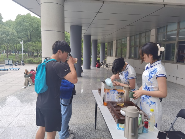 新生报到当天,旅游学院还为新生和家长们精心准备了迎客茶——扬州富春茶社独创的魁龙珠。魁龙珠茶是富春茶艺师用浙江龙井、安徽魁针加上富春花园自家种植的珠兰窨制而成,将魁针之色、龙井之味和珠兰之香完美交融,并取魁针、龙井、珠兰的前三字合为“魁龙珠”。因三种茶分别来自皖、浙、苏,被著名作家莫言誉为“一江春水三省茶”。入党积极分子张苏黔、彭灿灿身着古典服饰现场展示泡茶技艺,为前来报到的新生和家长一一送上迎客茶。“扬州是世界美食之都,能在大学校园里品尝到世界非遗扬州特色茶,非常高兴,也让我们体会到扬州人的热情。”迎新现场一位新生家长说道。