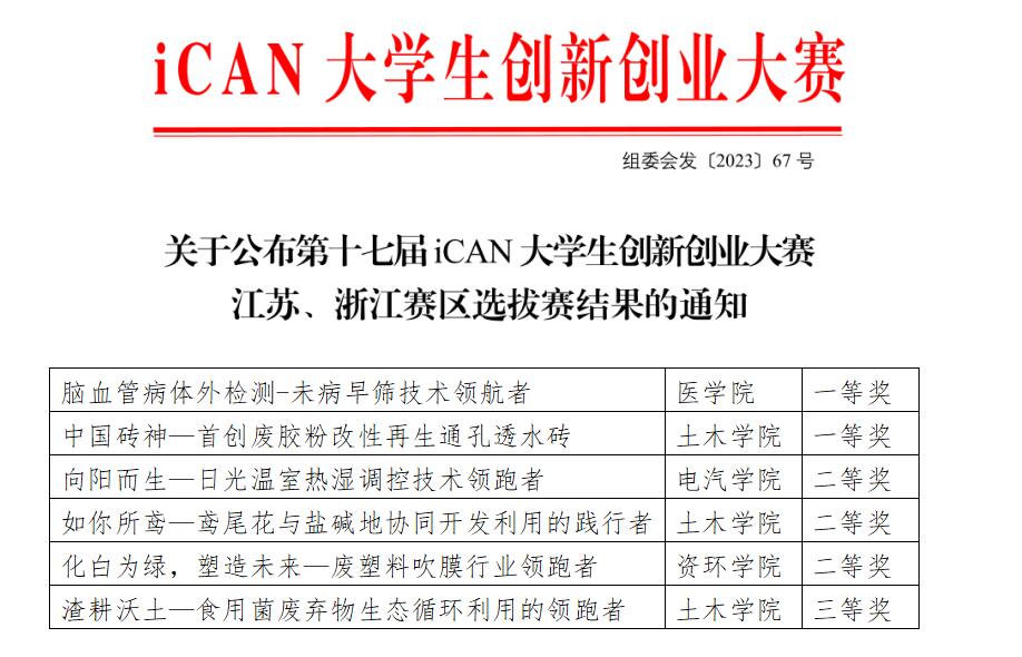 近日,第十七届iCAN全国大学生创新创业大赛江苏、浙江赛区选拔赛在苏州科技大学圆满落幕,我校学子以新颖的创意和不懈的拼搏,经历网评、决赛路演和答辩等环节,从众多知名本科高校中脱颖而出,共获得一等奖2项,二等奖3项,三等奖1项,共计6项省级奖项。
