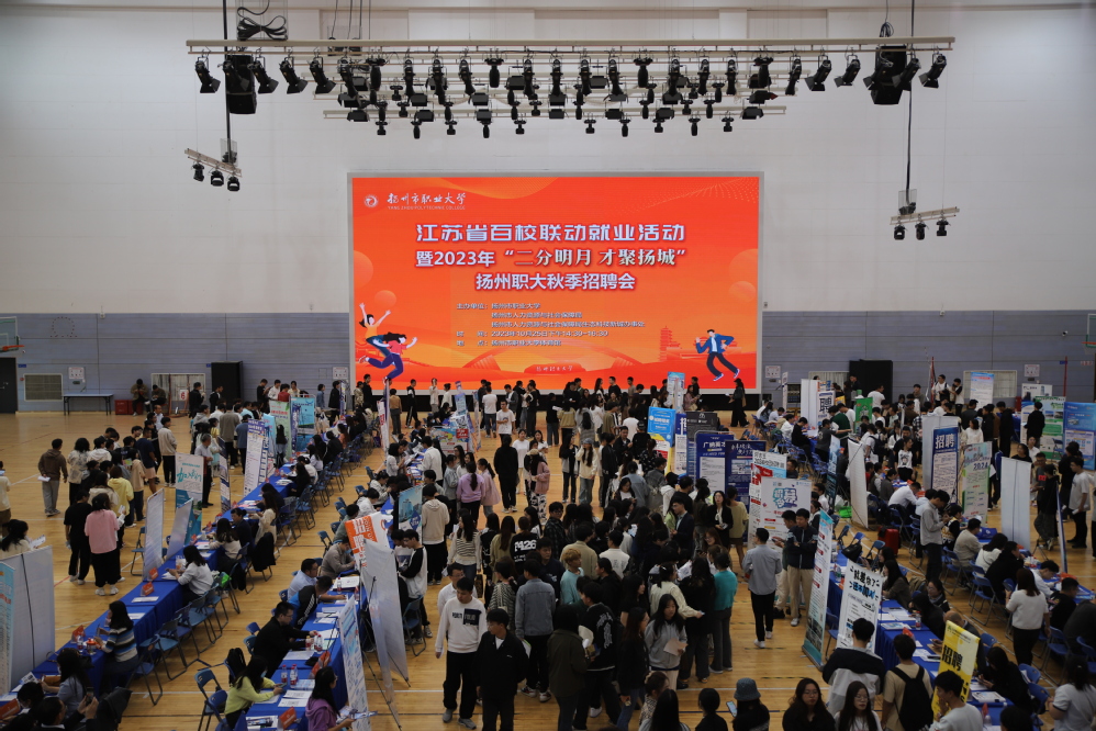 10月25日,江苏省百校联动就业活动暨2023年“二分明月·才聚扬城”扬州职大秋季综合场招聘会在学校体育馆举行。本次招聘会吸引了中船集团723所、扬杰电子、晶澳科技等112家企业,招聘岗位400多个,提供职位逾3000个。