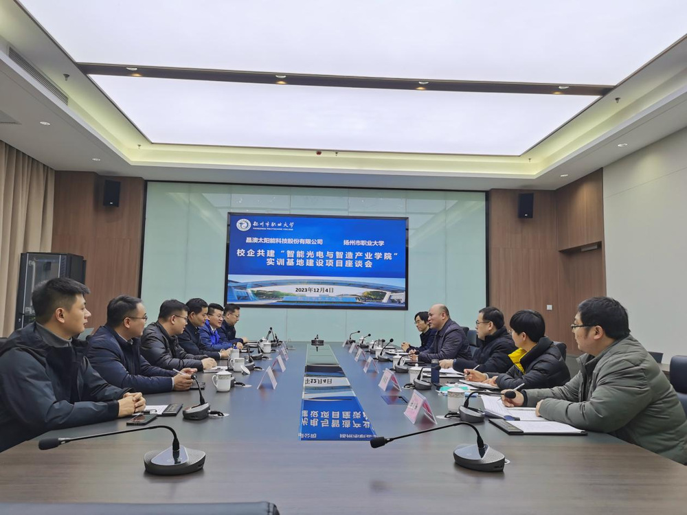 为进一步深化校企合作,加快推进校企共建产业学院工作,近日,我校与晶澳太阳能科技股份有限公司在科技综合楼304会议室召开校企共建“智能光电与智造产业学院”实训基地建设项目座谈会。晶澳人资总监邱民权、晶澳(扬州)人力资源部经理赵越、晶澳教育研究中心常务副理事战严、晶澳教育研究院院长刘虎城等企业专家受邀参加本次会议。会议由我校党委委员、副校长吴书安主持。