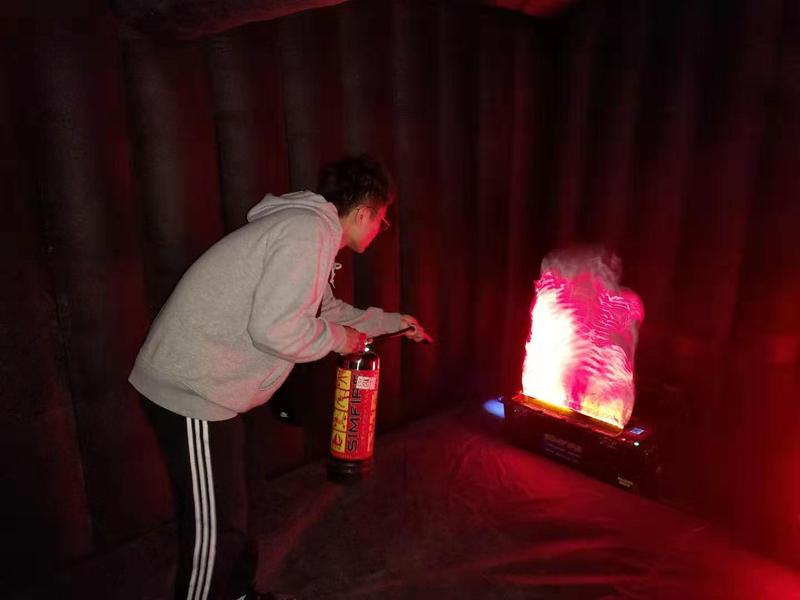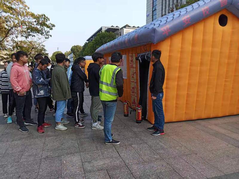 随后,又进行了消防帐篷逃生演练。真实的模拟火灾现场环境,在“模拟逃生帐篷”内,设置隔断墙,将帐篷像迷宫一样分隔成迂回曲折的走道空间,并分开设置1个进口和1个出口。多名师生分批次有序进入陌生、漆黑、烟雾环绕的模拟封闭“火灾现场”,刺鼻的烟雾(用安全的烟雾弹模拟火灾烟雾)把人熏得晕头转向,漆黑的环境,让人分不清东西南北,大家心情“噔”的一下立马进入“火灾现场”的真实状态,首先浮现在脑海中的问题就是怎么逃出去。在黑暗的环境里,师生们相互鼓励,保持镇定,不慌不乱。心中不断回想着刚才教官教授的火场逃生知识,弯腰一个接一个沿墙壁摸索前进,迅速寻找逃生通道。最后,师生齐心协力,在规定时间内成功逃离火场。