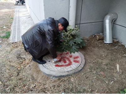 由于学校基建较多,且建设年代久远,为了区别污水、雨水、电缆井等众多阀门。12月13日保卫处消防科组织员工,对学校南北校区室内消火栓进水阀窨井盖进行油漆喷图识。